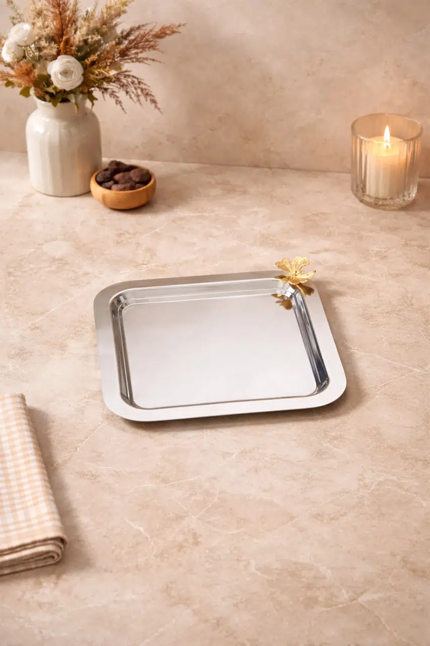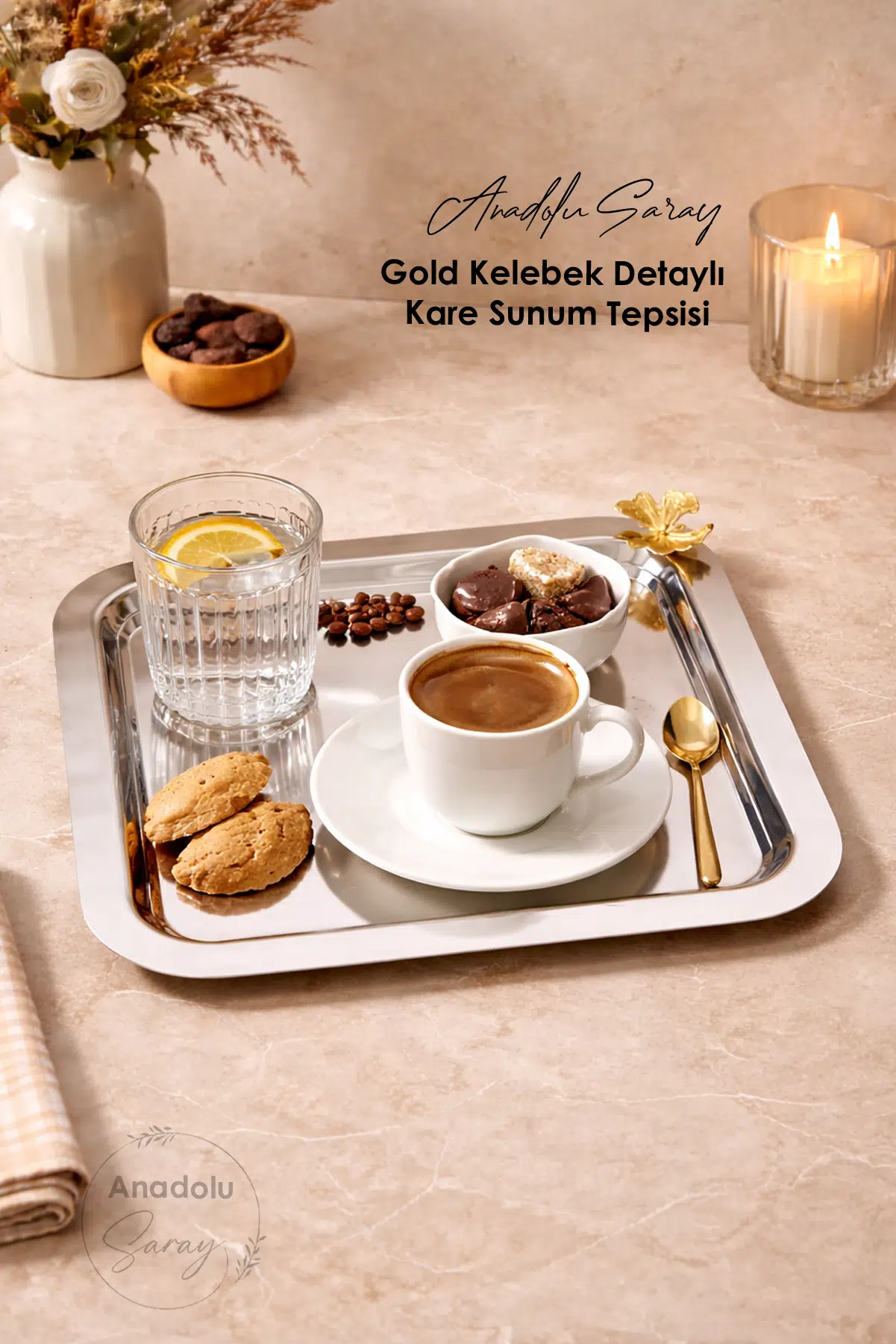 Gold kelebek detaylarıyla zarif bir dokunuş kazanan kare sunum tepsisi, modern ve şık sofralar için özel olarak tasarlanmıştır.