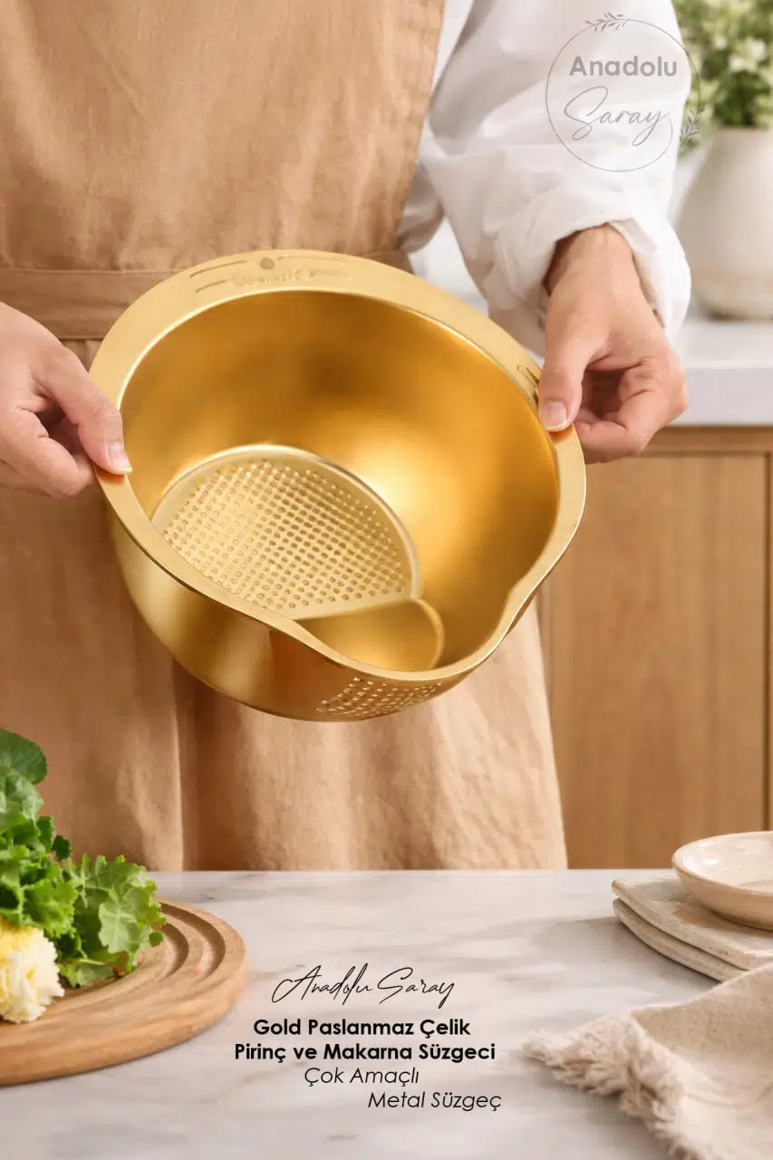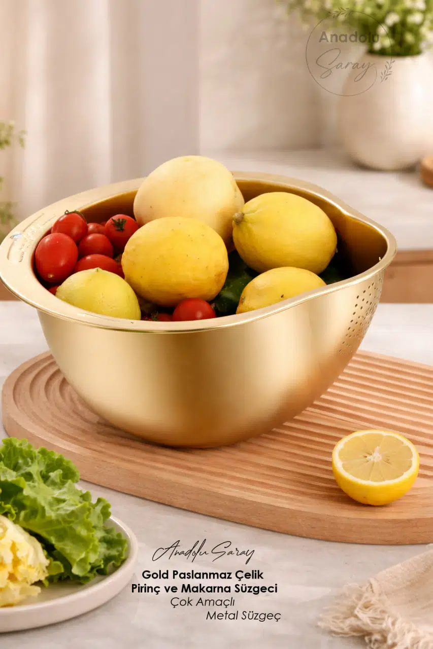 Mutfağınızda hem şıklığı hem de fonksiyonelliği bir arada sunan Gold Paslanmaz Çelik Süzgeç, pirinçten makarnaya, sebzeden salataya kadar birçok gıdayı pratik şekilde yıkamanız ve süzmeniz için tasarlanmıştır.