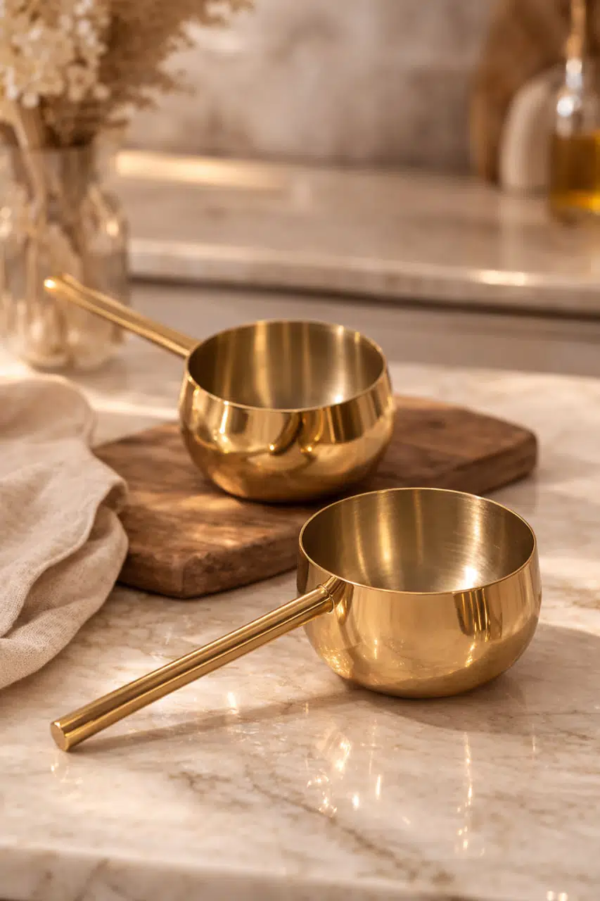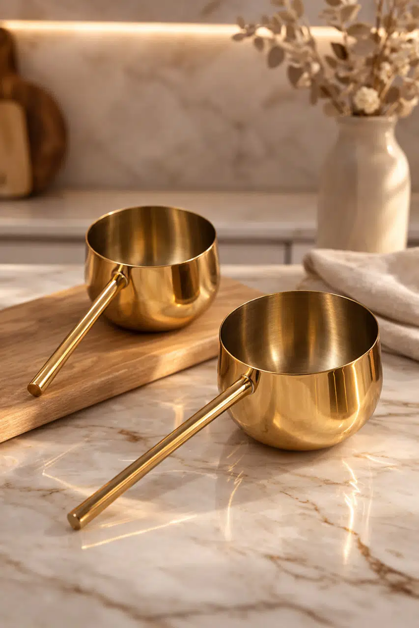 Mutfağınıza hem şıklık hem de pratiklik katacak Gold saplı sütlük sosluk, modern tasarımı ve kullanışlı yapısıyla günlük mutfak ihtiyaçlarınızı kolaylaştırır. Minimal ve estetik görünümü sayesinde hem pişirme hem de servis için ideal bir yardımcıdır. Parlak gold kaplama yüzeyi mutfağınıza zarif bir dokunuş katarken, ergonomik sapı rahat kullanım sağlar.