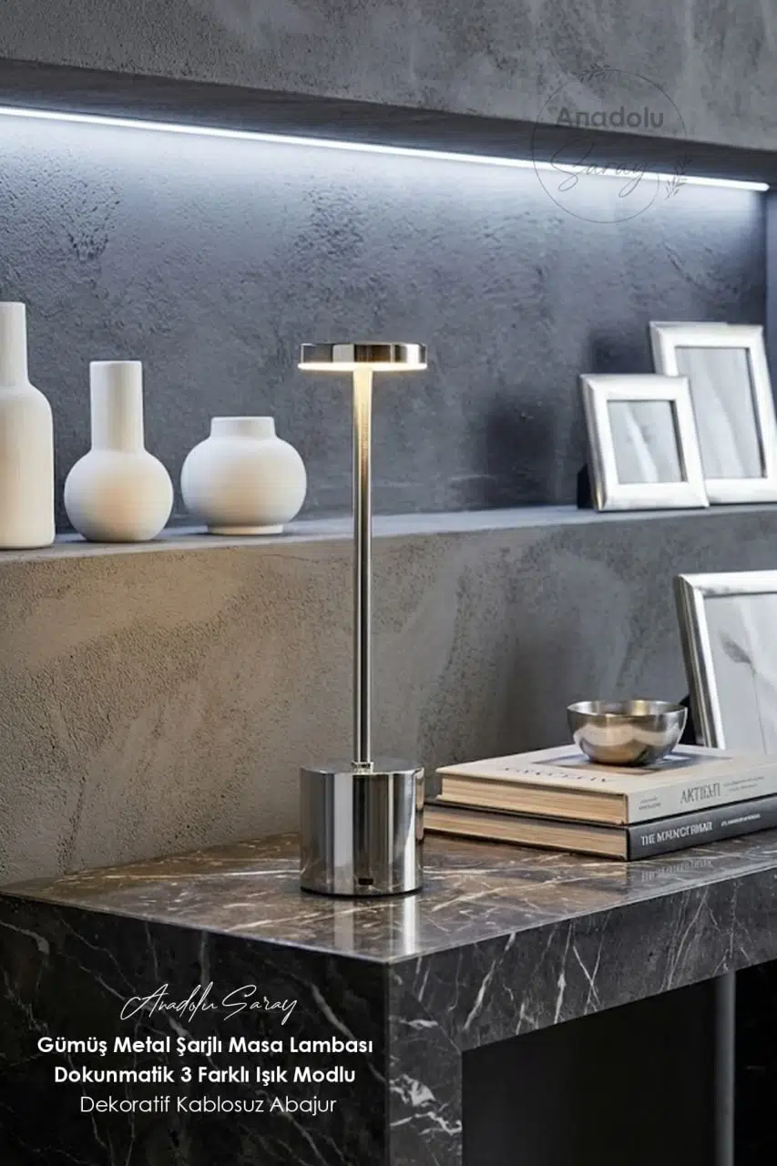 Paket İçeriği: 1 Adet Gümüş Dekoratif Şarjlı Masa Lambası 1 Adet USB Şarj Kablosu