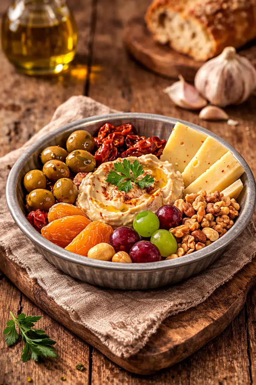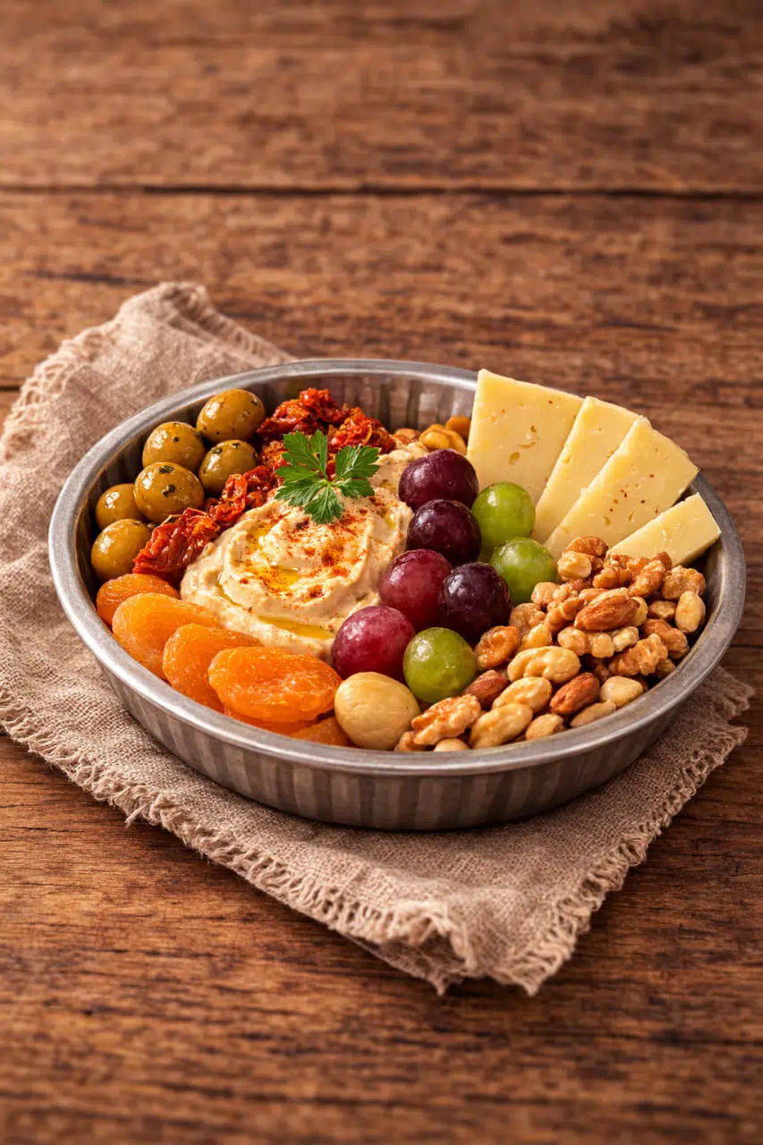 Hummus, zeytin, peynir, kuruyemiş, kuru meyve ve çeşitli mezeleri şık bir şekilde sunmanızı sağlar.