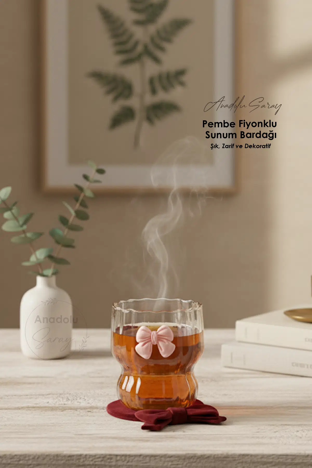 Renk: Şeffaf cam + pembe fiyonk detaylı