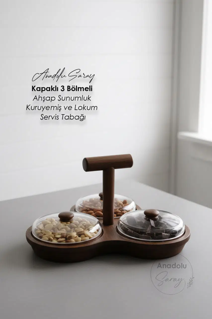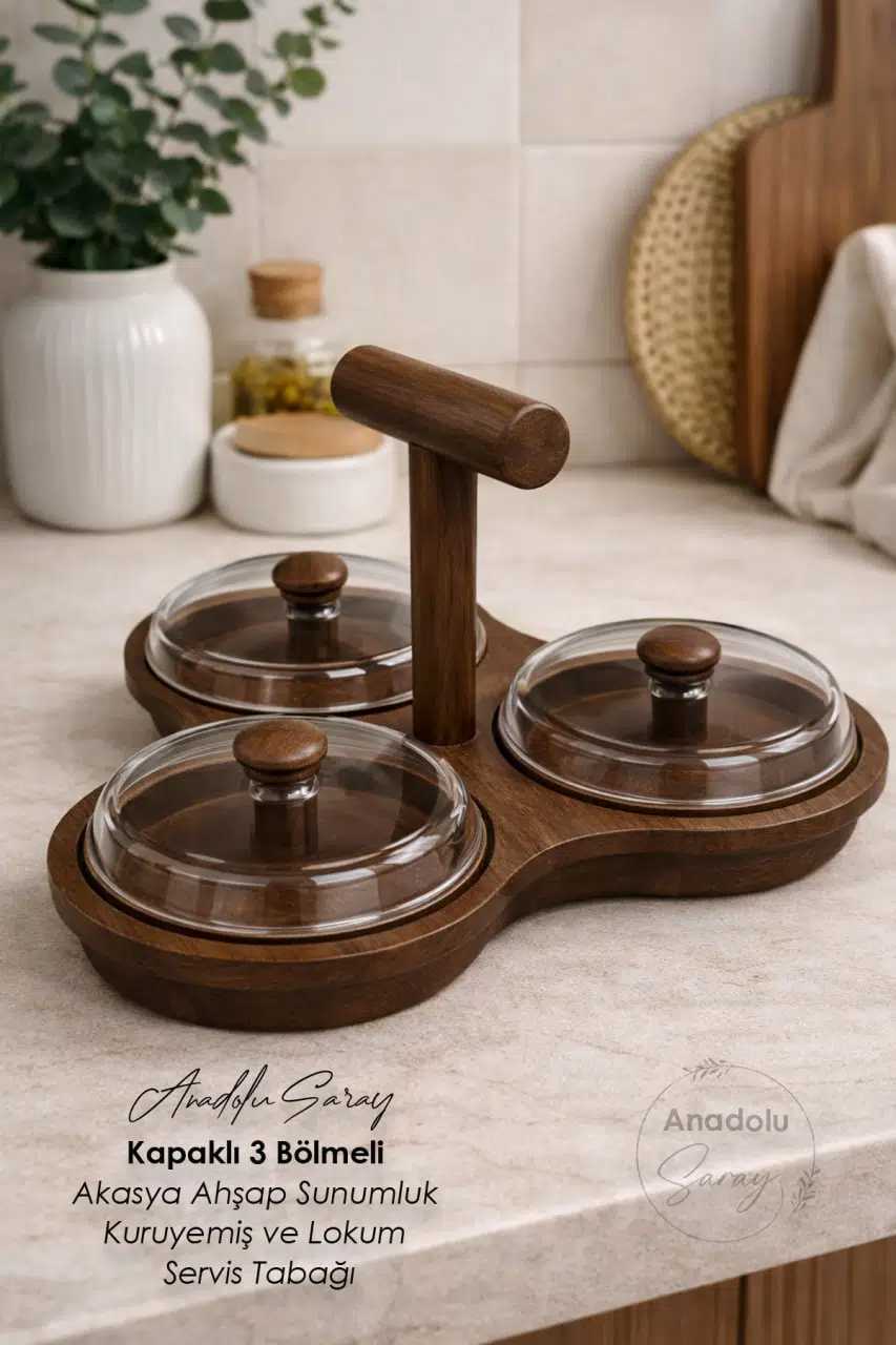 Şık tasarımı ve fonksiyonel yapısıyla sofralarınıza estetik bir dokunuş katan 3 bölmeli kapaklı ahşap sunumluk, hem günlük kullanım hem de misafir sunumları için ideal bir tercihtir.