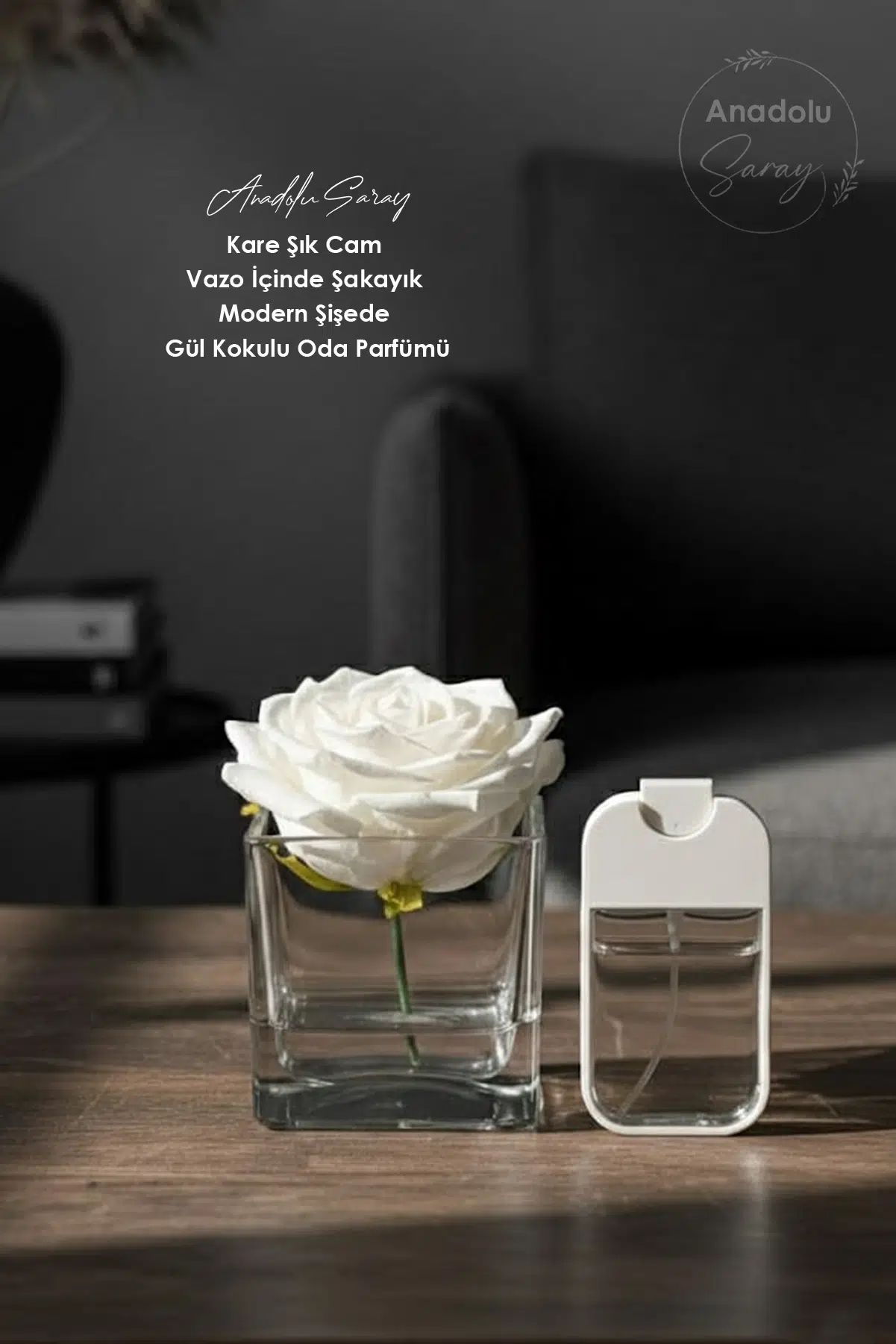 Setin tamamlayıcı parçası olan modern tasarımlı şişedeki gül kokulu oda parfümü, evinizin atmosferini anında değiştirir.