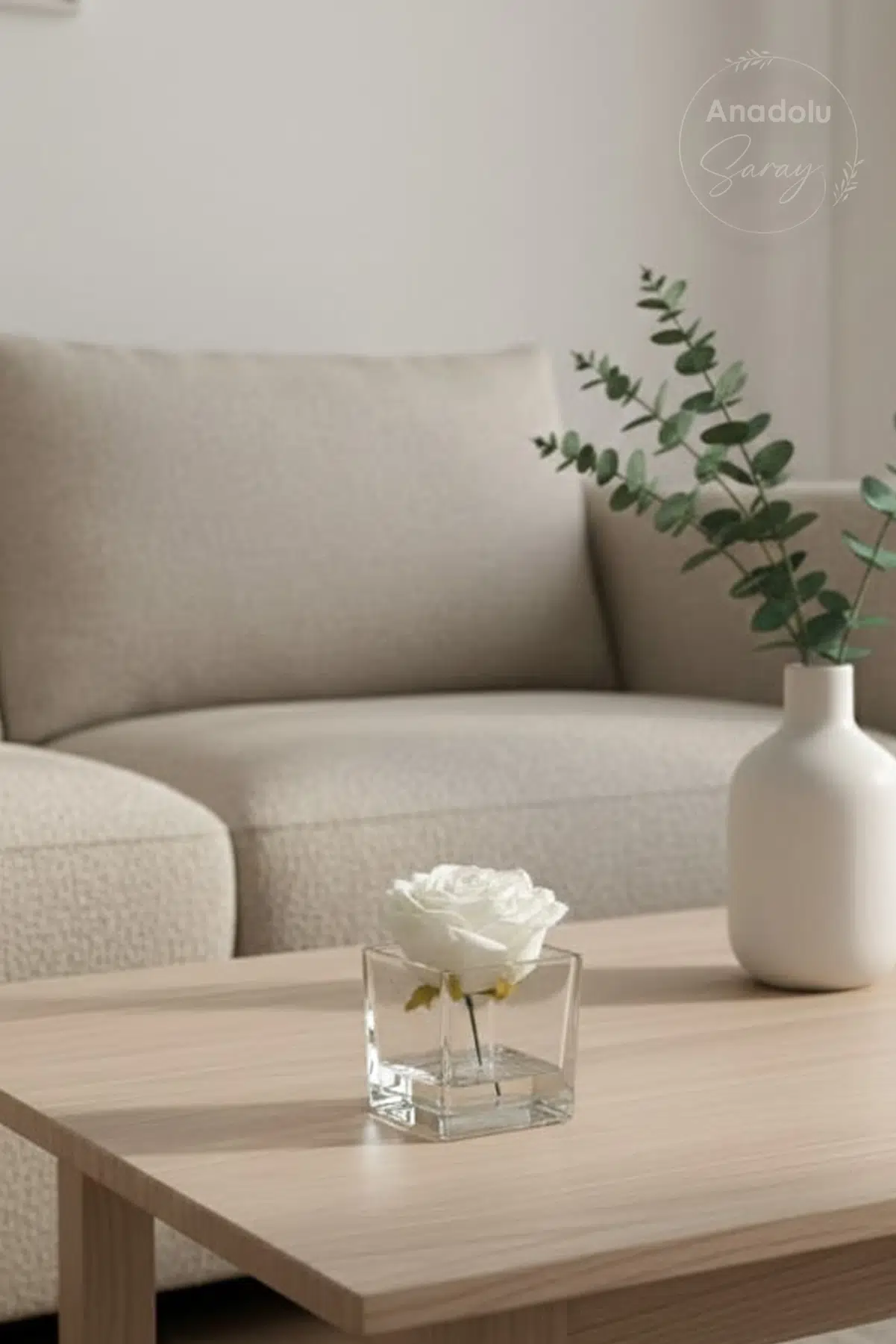 Bu estetik vazo ve çiçek kombinasyonu, salonunuzda, yatak odanızda veya çalışma masanızda modern ve minimalist bir stil yaratmanıza olanak tanır.