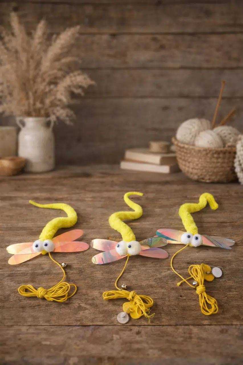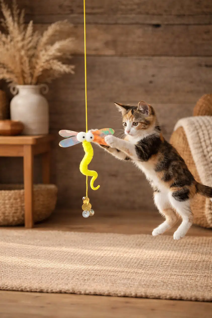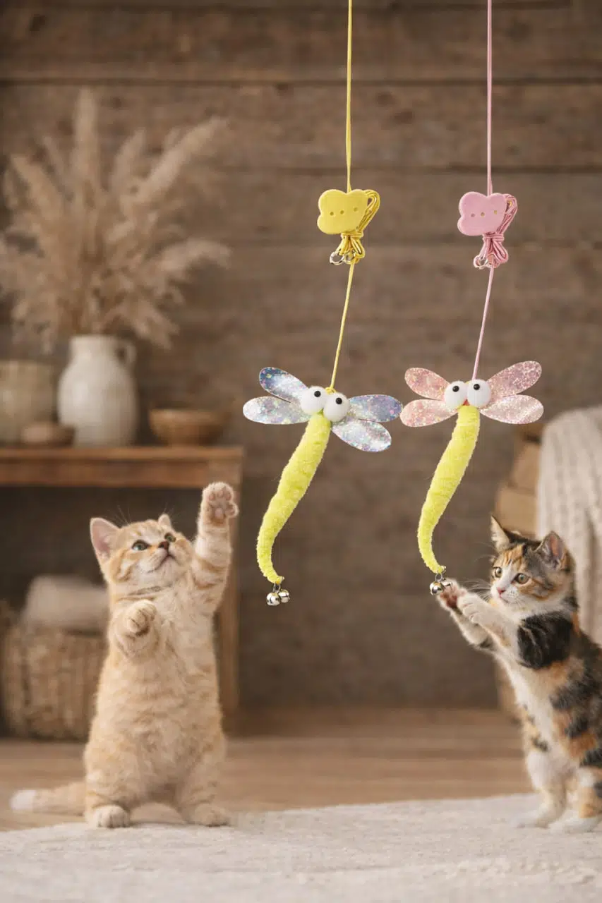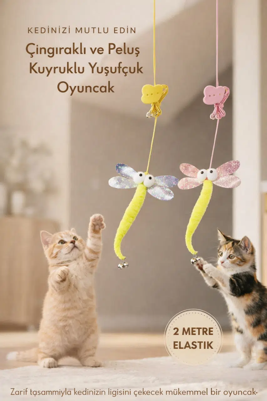 Esnek ve dayanıklı elastik ipi sayesinde hareketli bir oyun sunarken, parlak kanatlı yusufçuk tasarımı kedinizin dikkatini anında çeker.