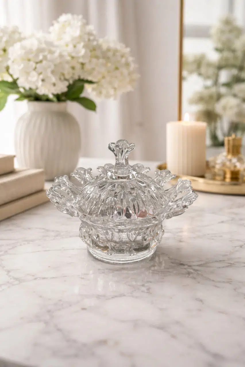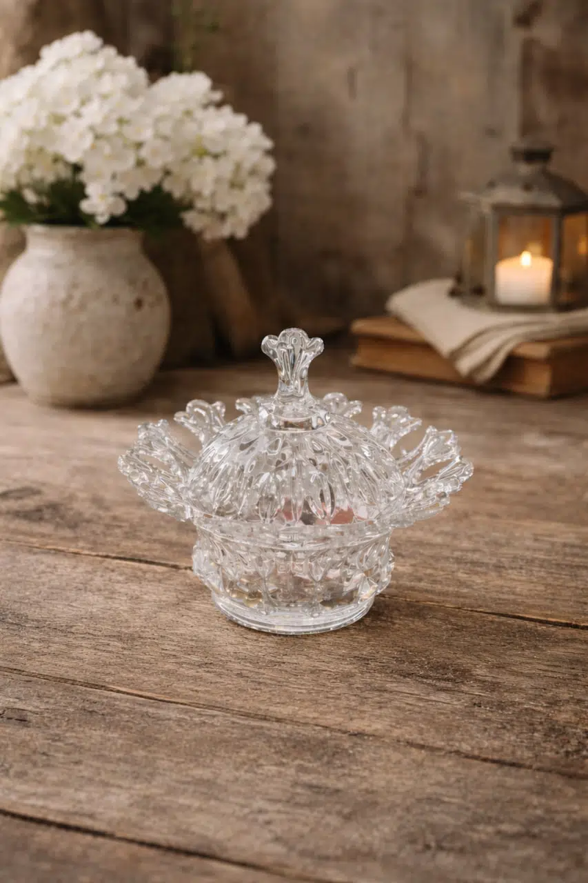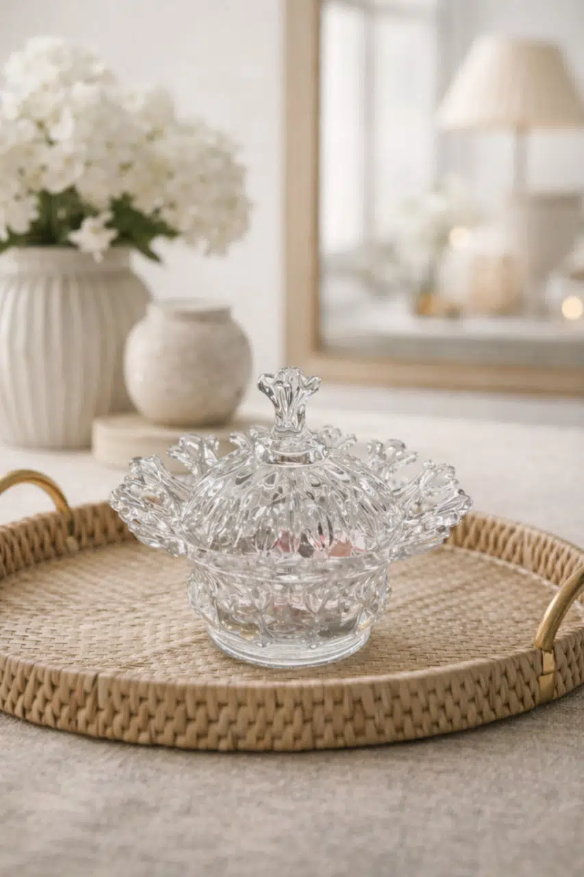 Zarif tasarımı ve göz alıcı kristal dokusuyla hazırlanan bu kapaklı cam şekerlik, sofralarınıza ve yaşam alanlarınıza şıklık katar.
