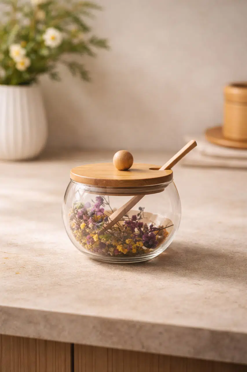 Cam gövdesi sayesinde içeriği kolayca görebilir, düzenli ve estetik bir sunum elde edebilirsiniz. Dayanıklı cam yapısı uzun ömürlü kullanım sunarken, bambu kapak kısmı ürüne sıcak ve doğal bir hava katar.