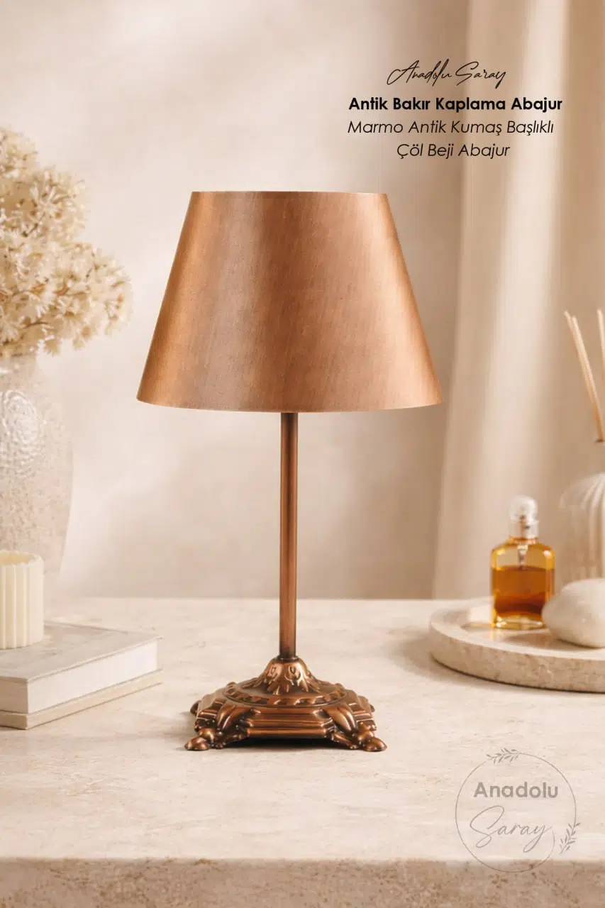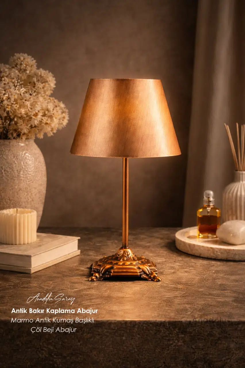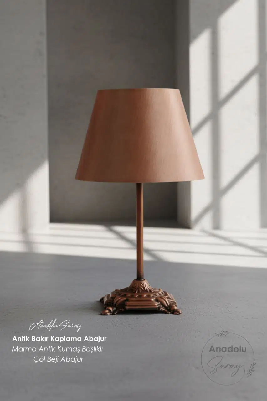 Antik bakır kaplamalı metal gövdesi, zamansız bir şıklık sunarken çöl beji tonlarındaki kumaş başlığı sayesinde ışığı yumuşak ve dengeli bir şekilde yayar.