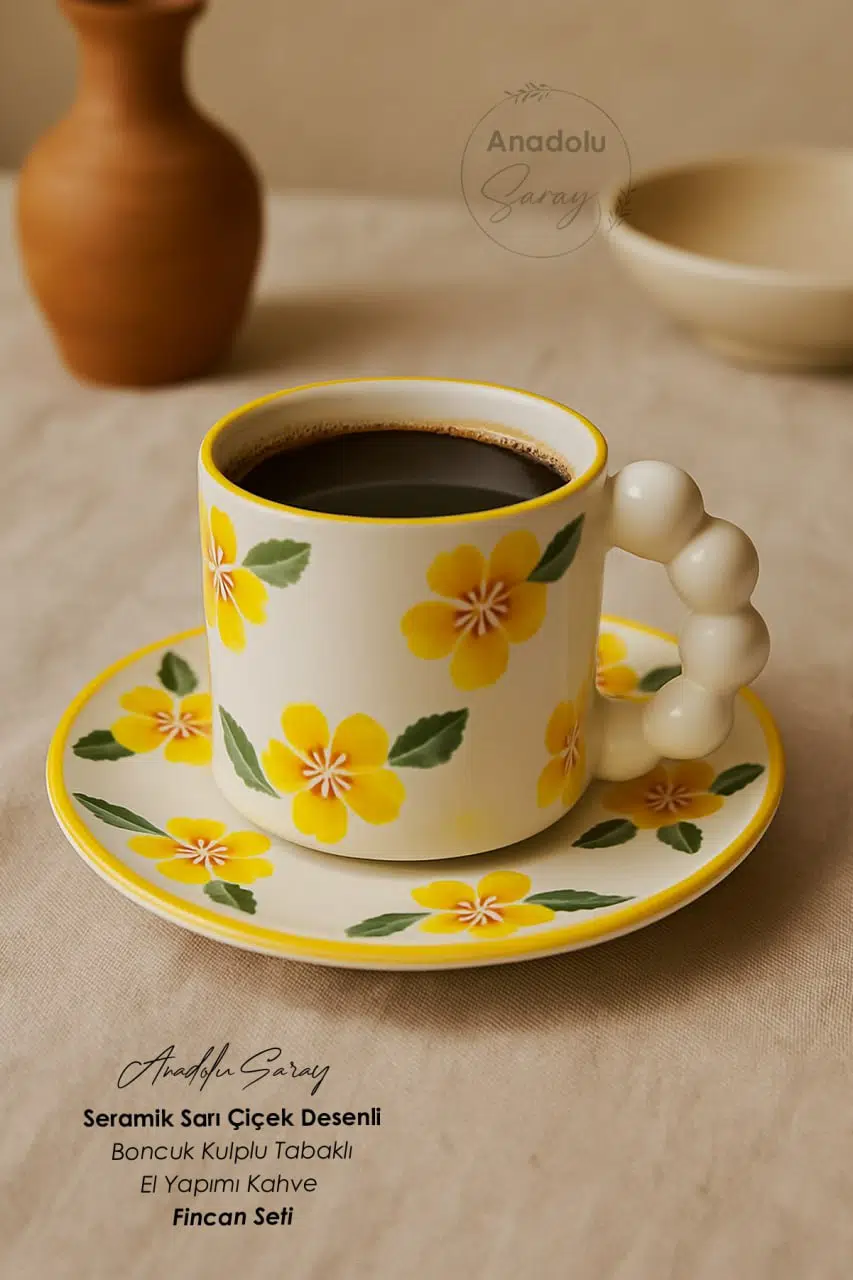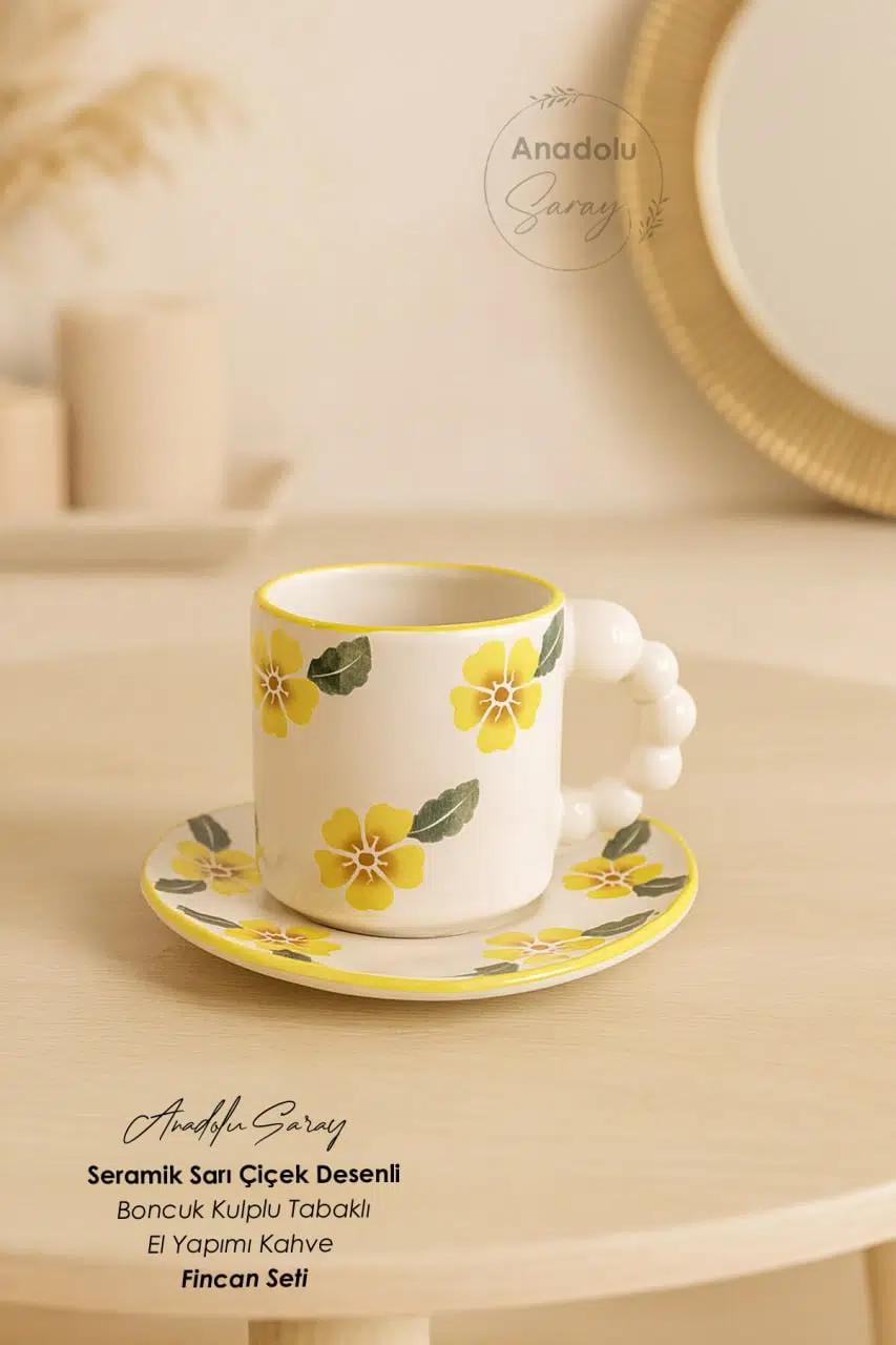 El işçiliğinin zarafetini modern tasarım dokunuşlarıyla buluşturan bu seramik kahve fincan seti, kahve keyfine estetik bir atmosfer kazandırmak isteyenler için özel olarak üretilmiştir. Canlı sarı çiçek desenleri ve dikkat çekici boncuk kulpu ile hem dekoratif hem de kullanışlı bir üründür.