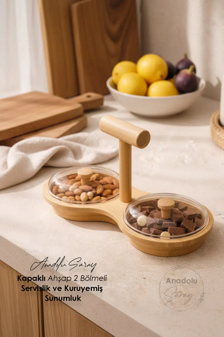İki ayrı bölmesi sayesinde kuruyemiş, çikolata, lokum, şekerleme, sos veya atıştırmalıklar hijyenik ve düzenli şekilde sunulabilir. Ürün üzerinde bulunan şeffaf kapaklar, içerisindeki gıdaları dış etkenlerden korurken, sunum esnasında içeriğin kolayca görülmesini sağlar. Kapaklı yapısı sayesinde tazeliği uzun süre muhafaza eder.