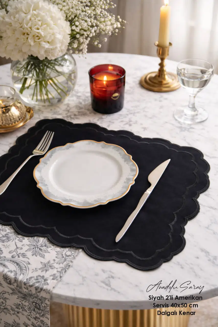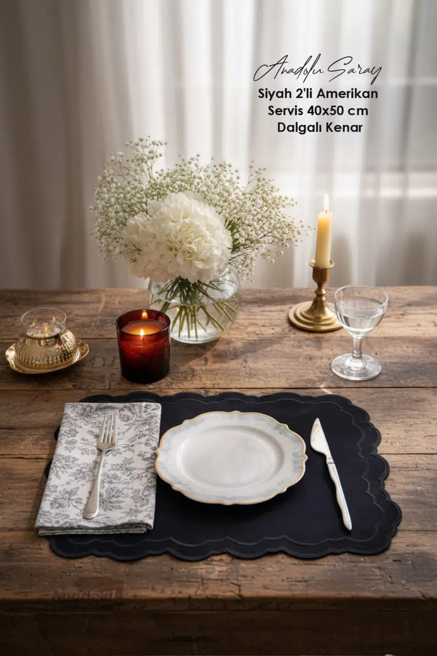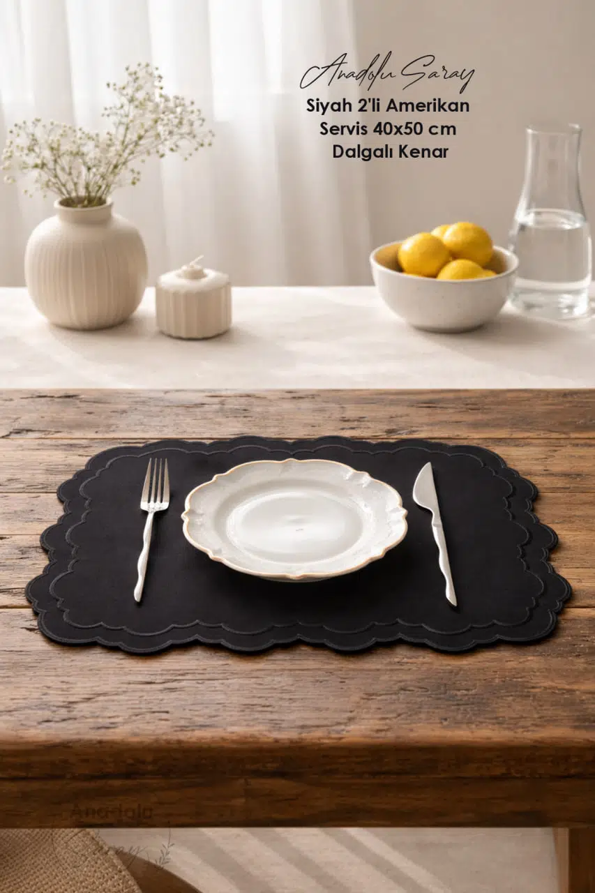 Sofralarınızda asalet ve şıklığı bir araya getiren 2'li Siyah Amerikan Servis Seti, modern sunumların vazgeçilmez parçasıdır. Özel tasarım dalgalı (dilimli) kenar kesimi ve derin siyah rengi ile yemek takımlarınızı ön plana çıkarır, masanıza sofistike bir dokunuş katar.