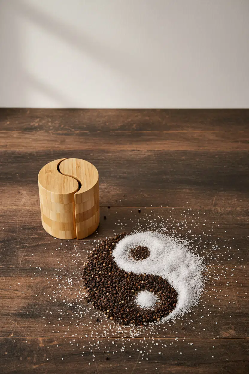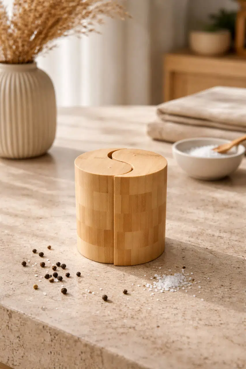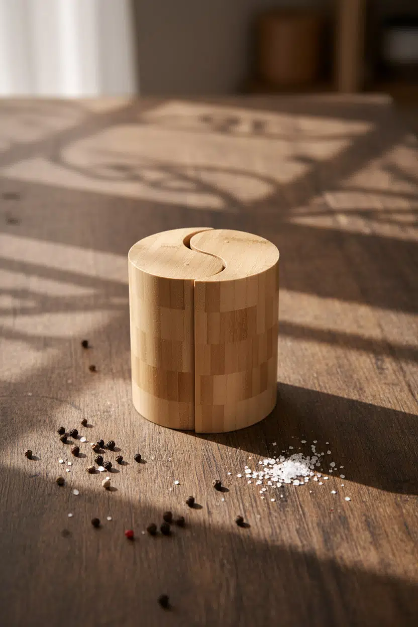 Yin yang formundaki özel kapak tasarımı sayesinde iki farklı baharatı tek bir kompakt gövdede şık şekilde saklayabilirsiniz. Minimal çizgileri ve doğal ahşap dokusu sayesinde modern, rustik ve sade dekorasyon stilleriyle uyum sağlar.