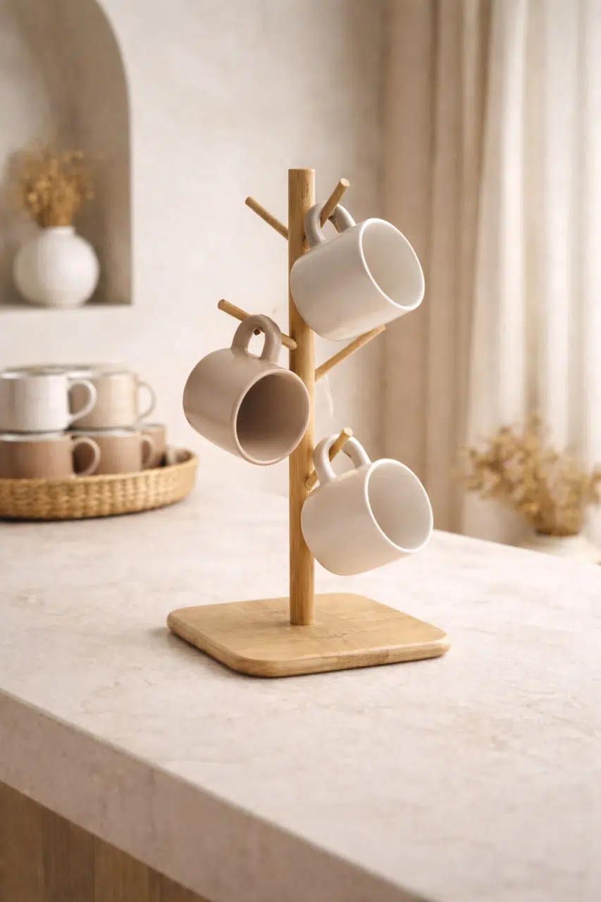 Minimal ve zamansız tasarımı sayesinde modern, bohem ve klasik dekorasyon stilleriyle uyum sağlar. Tezgah üstünde yer kaplamadan fincan ve kupalarınızı düzenli şekilde sergilemenize yardımcı olur.
