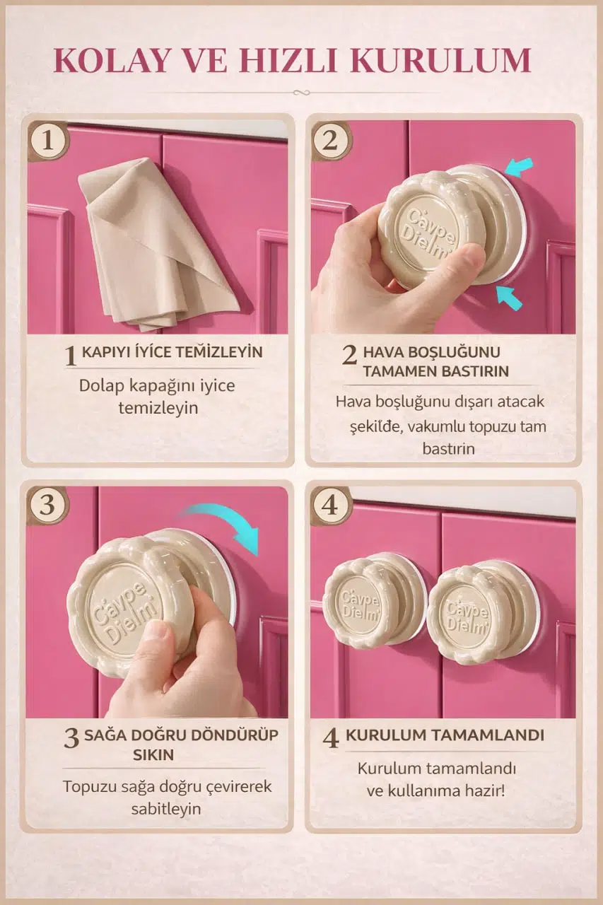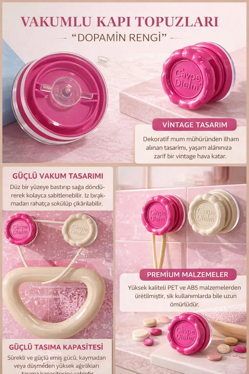 Vakumlu kapı topuzu, delme ve yapıştırma gerektirmeyen pratik montaj sistemi sayesinde yaşam alanlarınızda hem fonksiyonel hem dekoratif bir çözüm sunar. Güçlü vakum teknolojisi ile düz ve pürüzsüz yüzeylere kolayca tutunur, iz veya kalıntı bırakmadan sökülebilir.