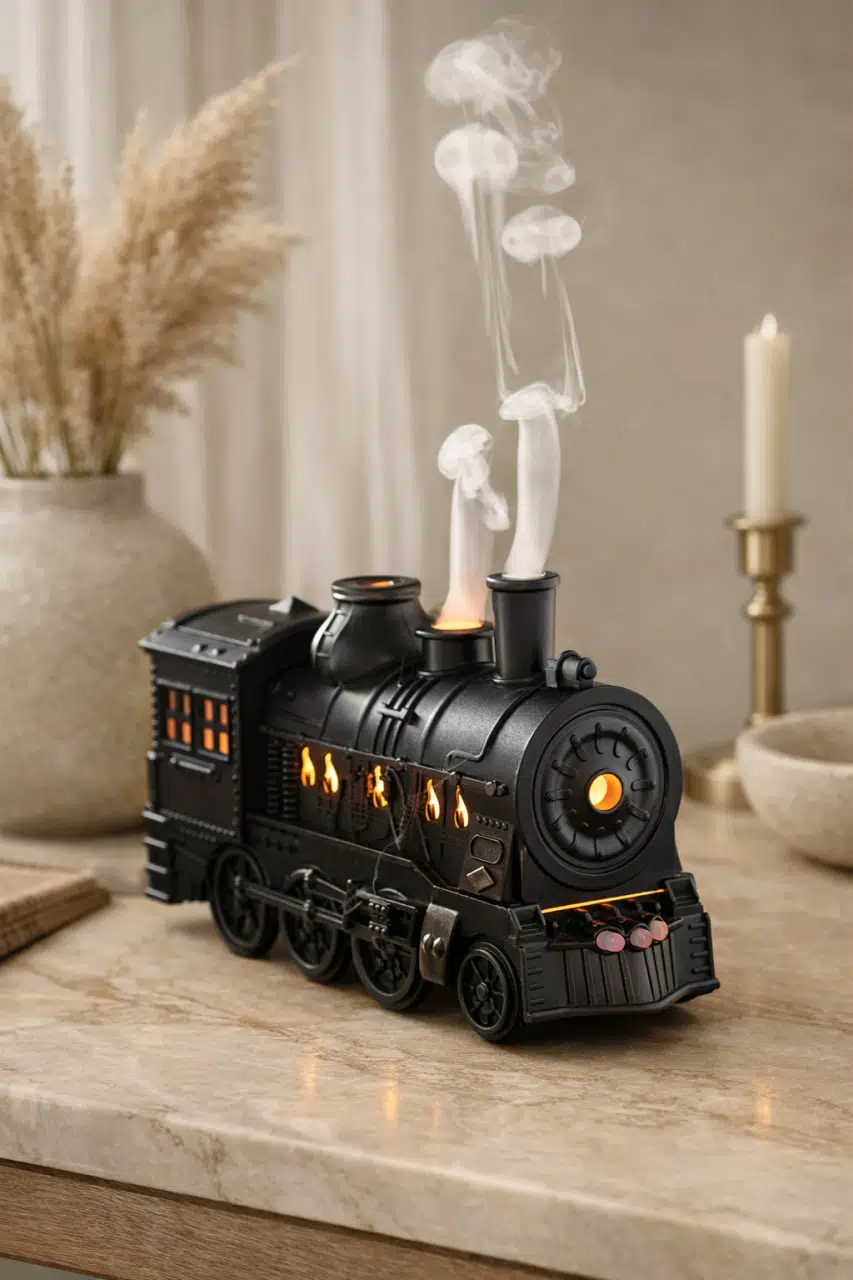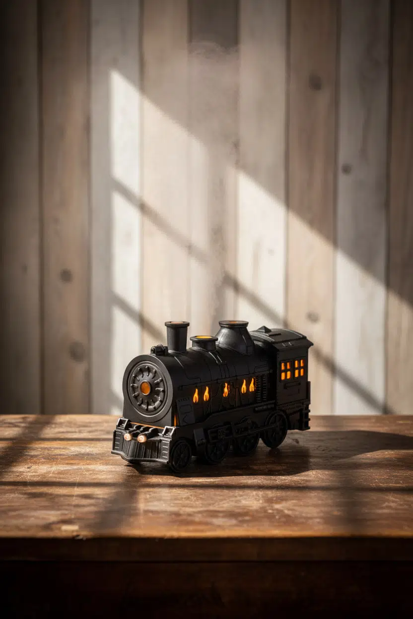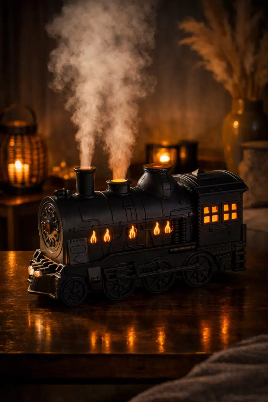 Tren bacasından çıkan yoğun buhar efekti, ürüne nostaljik ve etkileyici bir görünüm kazandırır. İç kısımdaki LED ışık detayları ise akşam saatlerinde sıcak ve huzurlu bir ambiyans oluşturur. Dekoratif aydınlatma olarak da kullanılabilir.