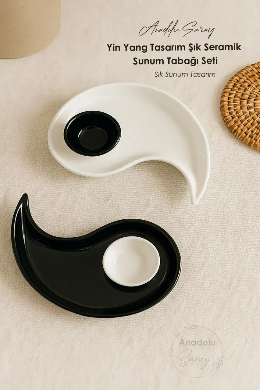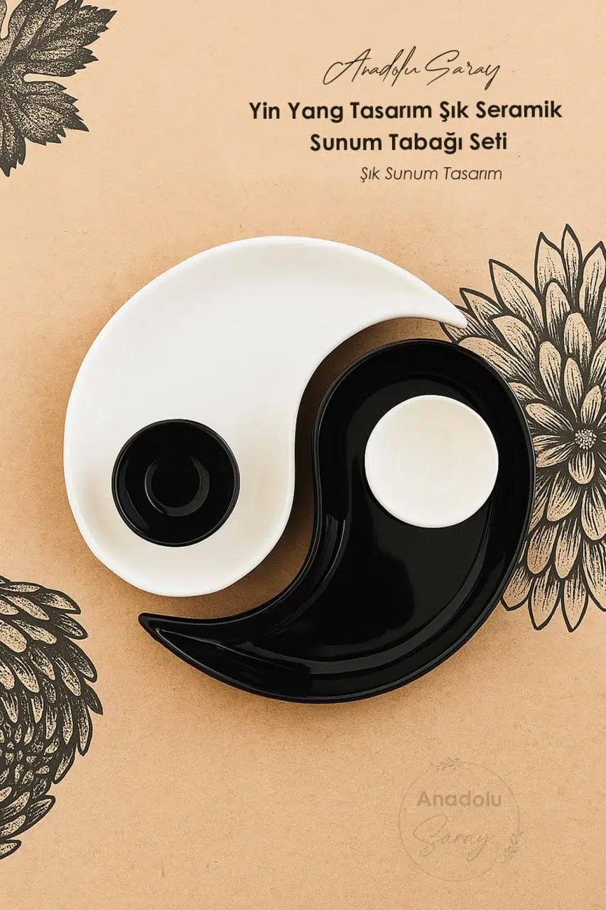 Modern sofraların zarafetini yansıtan Yin Yang tasarımlı seramik sunum tabağı, sade şıklığı ve işlevselliği bir araya getirir.